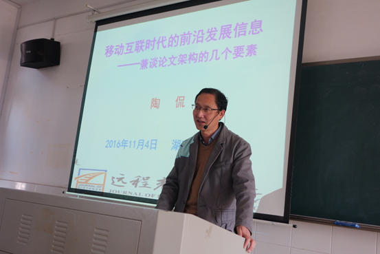 11月4日,中国教育技术协会理事,中国教育技术协会期刊专业委员会副主任,中国教育技术协会教育游戏分会副理事长,华人探究学习协会理事,《远程教育杂志》(CSSCI)执行副主编兼编辑部主任陶侃教授应邀来我校讲学,为200余名师生作了以“移动互联时代的前沿发展信息——兼谈论文架构的几个要素”为主题的学术报告。校长助理、36365最新线路检测院长李勇帆教授主持报告会。